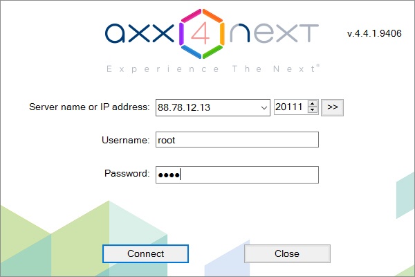 Uruchom Klienta, a następnie podaj zewnętrzny adres IP oraz zewnętrzny port bazowy Serwera w ustawieniach połączenia (zobacz: Uruchamianie Klienta Axxon Next).