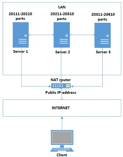 - Podczas nawiązywania połączenia przez Klienta wpisać publiczny adres IP routera oraz porty: 20111 dla Serwera 1; 20211 dla Serwera 2; 20311 dla Serwera 3.