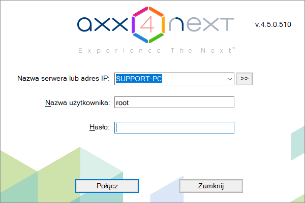 Po wykonaniu tych akcji, pojawi się okno autoryzacyjne Klienta Axxon Next. Aby całkowicie wyłączyć Klienta Axxon Next, naciśnij Zamknij.