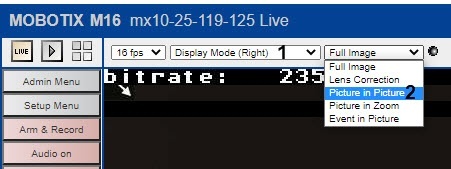 - Aby wideo z kamery uwzględniało odczyt temperatury, zaznacz opcje Display Mode (Right) (1), a następnie Picture in Picture (2).