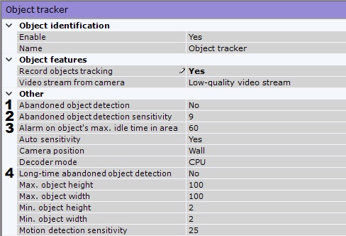Parametr czułości dla pozostawionych obiektów jest zależny od poziomów światła, i powinien zostać określony empirycznie. Zalecane jest rozpoczęcie kalibracji od czułości równej 20.