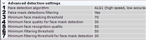 - Określ wartość dla parametru Minimalny próg rozpoznania maseczki na twarzy (7) - określa to procent prawdopodobieństwa detekcji, który jest wymagany, aby wykryć twarz jako zamaskowaną. Jeśli prawdopodobieństwo, że twarz jest zamaskowana, jest niższa, dana ścieżka zostanie zignorowana. Wartość należy wyznaczyć metodą prób i błędów; zalecane są wartości powyżej 30.