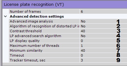 Domyślnie, zdarzenie rozpoznania tablicy rejestracyjnej jest zapisywane po tym, gdy ścieżka obiektu zawierającego tablicę rejestracyjną przemieści się poza pole widzenia kamery. Możesz skonfigurować moment rejestracji w polu Limit czasu (8), wpisując wartość w sekundach, lub wtedy, gdy zostanie przekroczona wartość w polu Dokładność rozpoznanego numeru, % (5). Jeśli oba parametry są różne od zera, zdarzenie rozpoznania tablicy będzie zapisane wtedy, gdy pierwszy warunek zostanie spełniony.