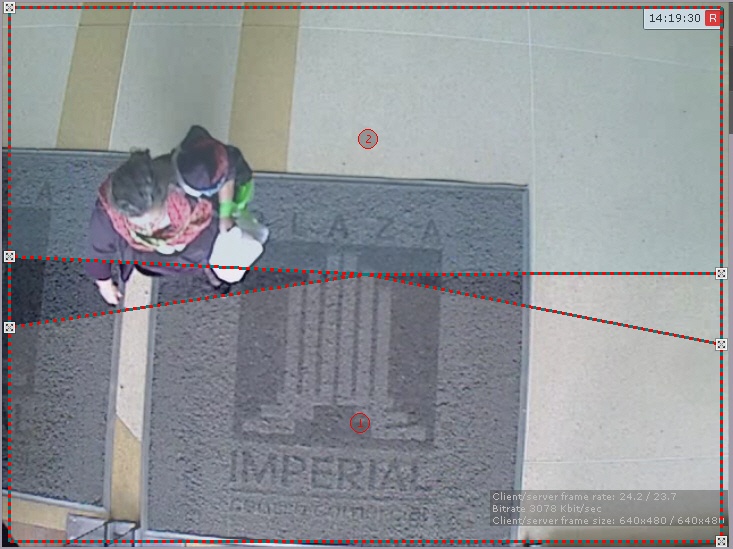 W oknie podglądu kamery, wyznacz strefę detekcji. Jest ona podzielona na dwa sektory: #1, oraz #2. Gdy obiekt porusza się ze strefy #1 do strefy #2, jest to traktowane jako wejście; jeśli obiekt porusza się ze strefy #2 do strefy #1, system uzna to za wyjście.