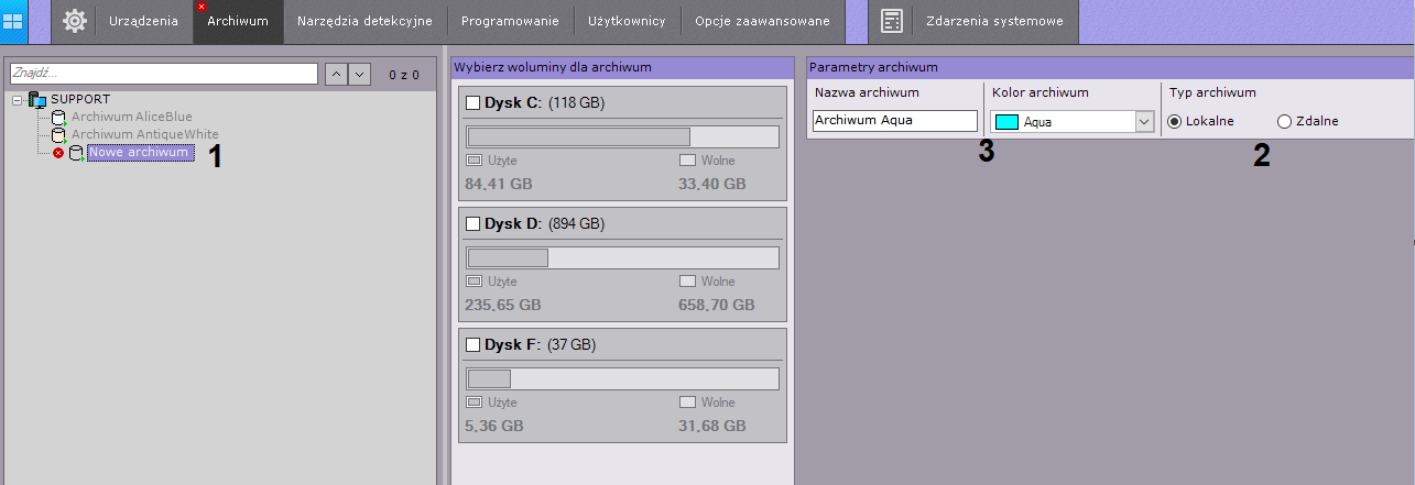 Podczas wybierania dysku, na którym masz zamiar umieścić wolumin archiwum, weź pod uwagę jego rozmiar. Jeśli archiwum zostanie całkowicie wypełnione danymi, najnowsze dane będą zapisywane w miejscu najstarszych.