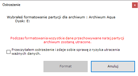 Jeśli woluminy są tworzone w formie partycji, wyświetli się okno dialogowe informujące o potrzebie sformatowania odpowiednich dysków systemowych. - Sprawdź listę partycji, które zostaną sformatowane. Jeśli lista jest poprawna, zaznacz Przeczytałem ostrzeżenie i zdaję sobie sprawę z ryzyka utracenia ważnych danych, a następnie naciśnij Format. W innym przypadku, naciśnij Anuluj i wróć do ustawień archiwum.