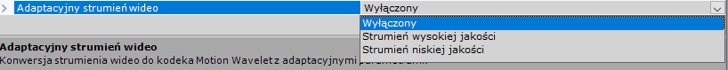 - Jeśli kamera wideo wspiera jednoczesną transmisję kilku strumieni wideo, zaznacz strumień, który ma być skonwertowany na format Motion Wavelet z listy Adaptacyjny strumień wideo.