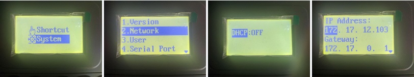 - Wyznacz adres urządzenia kontroli w menu Select System - Network, a następnie wyłącz DHCP i ustal adres IP oraz bramę domyślną.