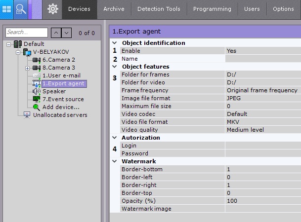 - Wyznacz pełną ścieżkę do folderów, w którym będą przechowywane wyeksportowane stopklatki oraz nagrania wideo (3). Wpisz nazwę użytkownika oraz hasło, jeśli eksportowane nagrania mają trafić do katalogów sieciowych (4). Jeśli pliki mają znajdować się w katalogu NAS, użytkownik musi posiadać odpowiednie uprawnienia dostępu.