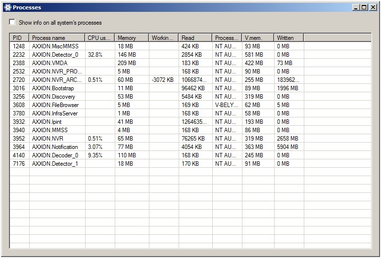 Lista wszystkich możliwych procesów Axxon Next jest przedstawiona poniżej.