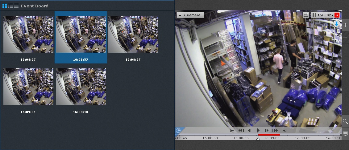Jeśli Panel Zdarzeń jest powiązany z kamerą, naciśnięcie na zdarzenie spowoduje zmianę trybu kamery na tryb Archiwum w czasie, w którym odbyło się dane zdarzenie.