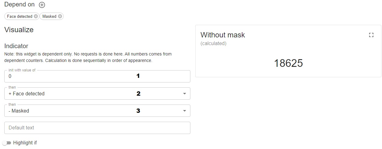 W przykładzie widżet zlicza ilość osób bez maski; początkowa wartość 0 (1) jest dodawana do liczby wykrywanych twarzy (2), a następnie odejmowana jest liczba twarzy w maskach (3).