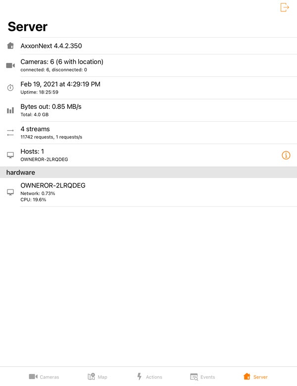 When connected to the Axxon Next Server, the following information is displayed: