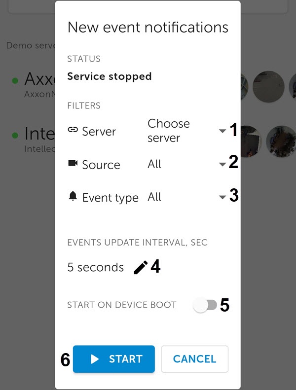 - Jeśli usługa notyfikacji w tle ma być włączana automatycznie po restarcie urządzenia Android, zaznacz opcję START ON DEVICE BOOT (5).
