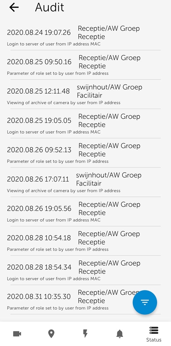When connected to the Axxon Next Server, on the Status tab, you can view the audit log for all Server domains. To do this, on this tab, click the OPEN button in the Audit item.
