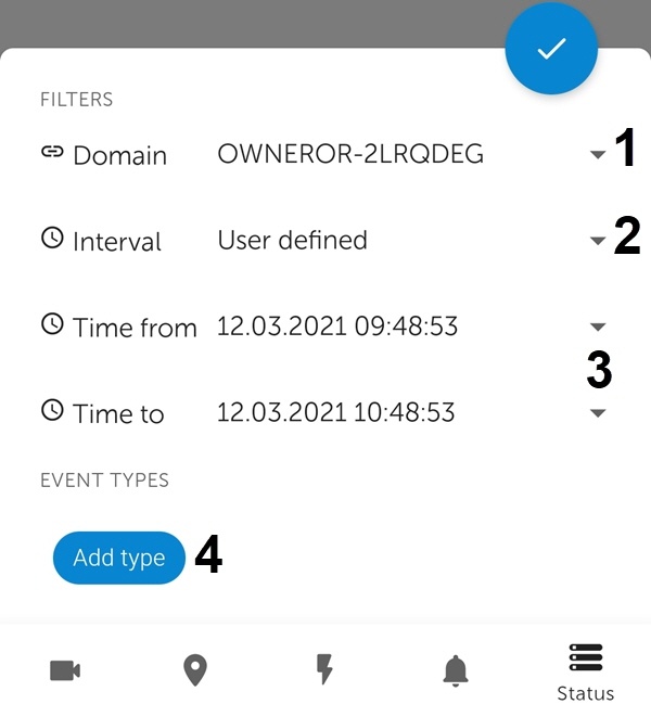 - Select one of the preset time intervals to display the corresponding events (2). To set the custom time interval, select the User defined value.