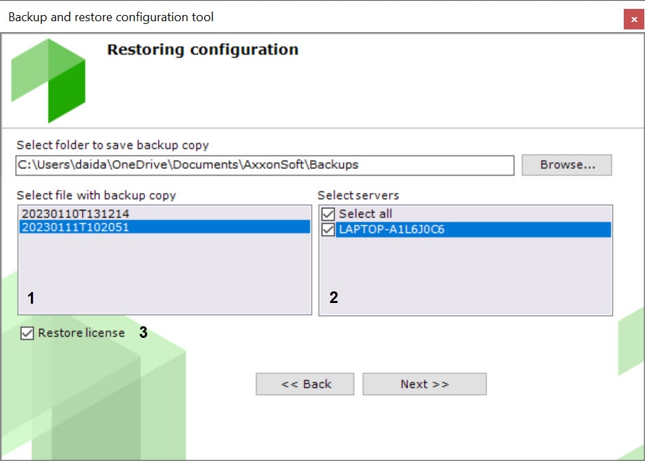 - Set the Restore license checkbox (3) to restore the license key that was saved at the configuration backup stage (see Configuration backup). If you do not restore the license, the system will work in demo mode.
