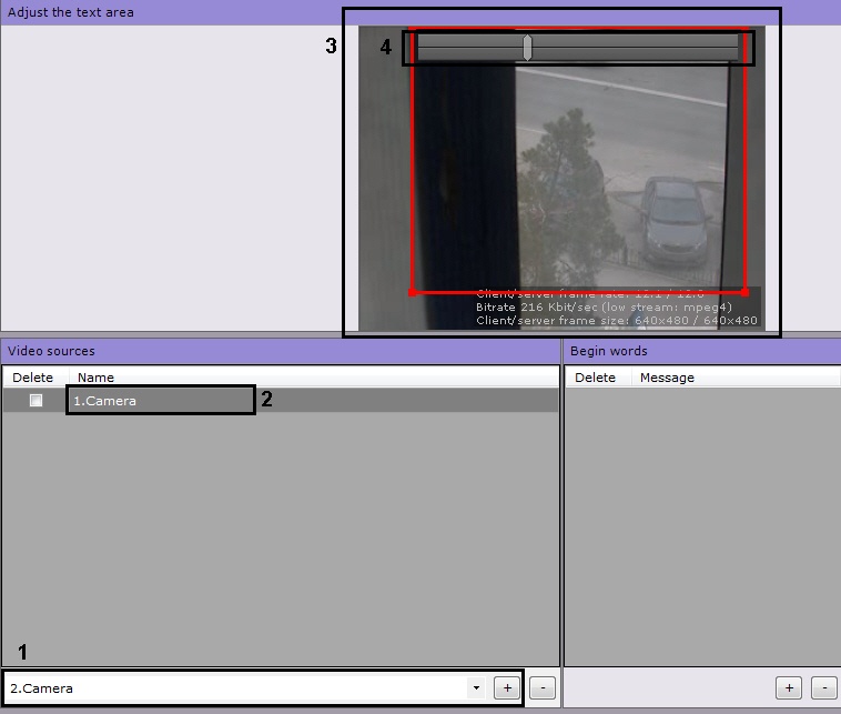 - Select a camera in the Video sources group (2). The Adjust the text area group shows video from the selected camera and the adjustable titles area (3).