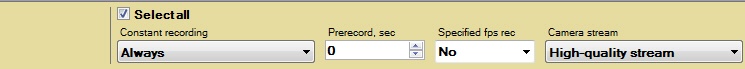 - Configure archive recording settings for the group of cameras (marked with yellow). The indicated settings for archive recording are applied to the selected cameras.