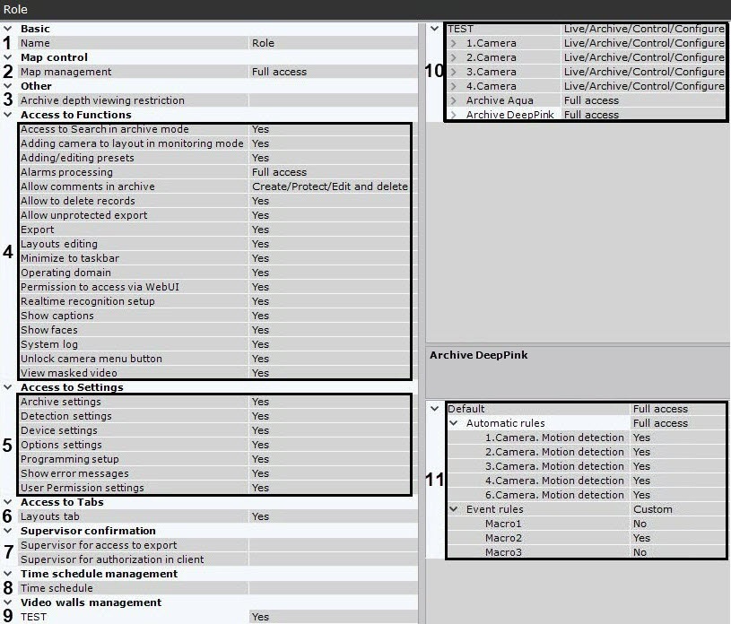 Parameters Access permission Description Basic Name − Enter a name for the role (1) Map control Select the access level to the maps for users with the current role (2) Map management View only You can only view maps View/move/scale You can views, move, and scale maps Full access All options available Other Archive depth viewing restriction − If you need to limit the access of users of a given role to all system archives, you can specify the archive depth limit in hours (3). If no limit is set, users may view all video recordings