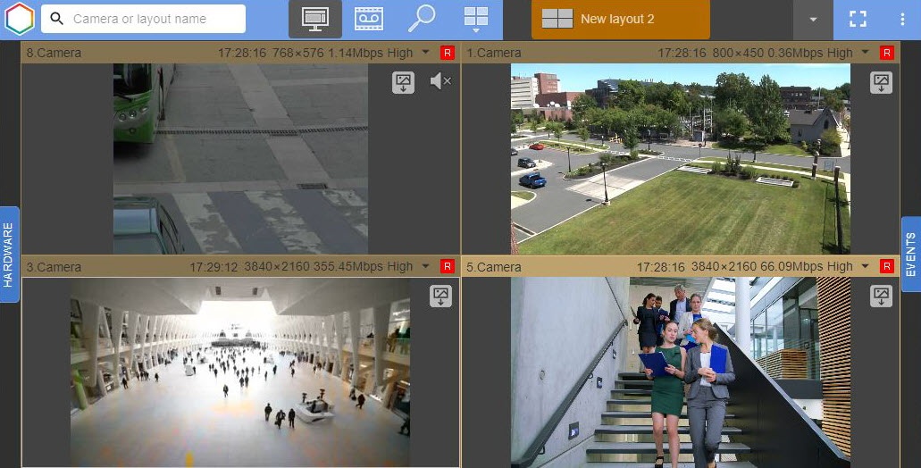 Web-Client GUI has the possibility to change the width of the cameras panel. To do this, click the left mouse button on the Hardware panel and drag it to the left or to the right.