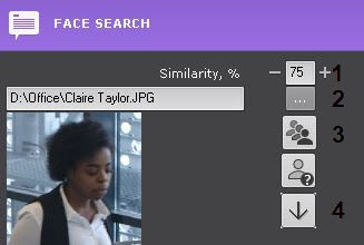 Set the minimum similarity level (in %) between the face in the photo and faces from the archive (1). The search results will contain only the video footage with faces with similarity levels above the set value.