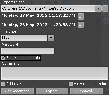 .Por defecto, el vídeo se exporta a un único fichero. Para exportar vídeos de distintas cámaras en ficheros independientes, deje sin marcar la casilla Exportar como un único fichero en la ventana de exportación.