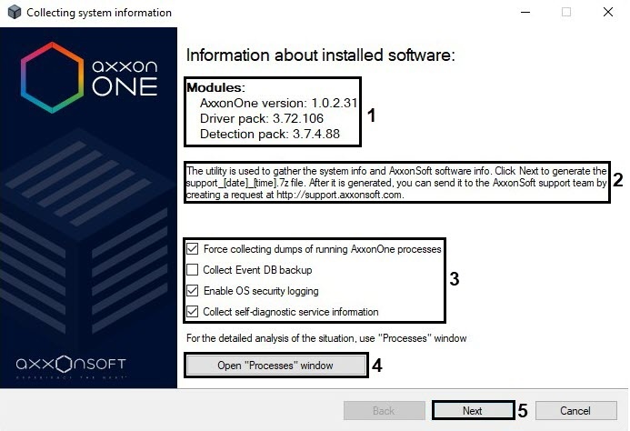 La interfaz de usuario de la herramienta Support.exe incluye los siguientes elementos: