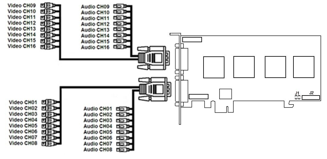 WS-216 비디오 캡처 카드에는 2개의 외부 DVI-I 핀이 있습니다. 비디오 및 오디오 연결은 그에 따라 DVI-I/BNC 및 DVI-I/RCA 스텁의 도움으로 수행됩니다. WS-216 비디오 캡처 카드의 외부 핀 1개에 최대 8대의 카메라와 최대 8개의 음원을 동시에 연결할 수 있습니다. Watchdog 케이블은 J1 핀에 연결됩니다. DI/DO 카드는 J2 핀에 연결됩니다.
