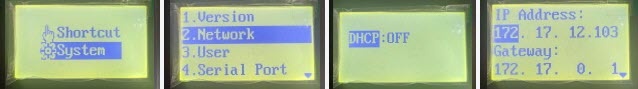 - Set the control device address: Select System − Network in the device internal menu, then disable DHCP and set IP address and gateway.