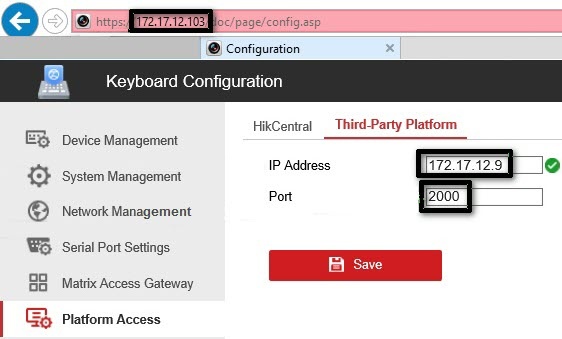 Set the Axxon One server IP address and port on the device. Open the device Web interface by entering the above set IP address in the web browser, then select Platform Access − Third-Party Platform.