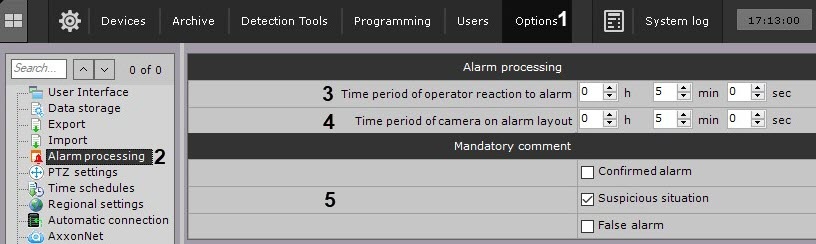 알람에 대한 운영자자 반응 기간 필드에 처리를 위해 알람을 수락하고 이를 평가하지 않고 알람 모드를 종료한 운영자가 알람 모드로 돌아가야 하는 시간을 입력합니다 (3). 최소값은 2분입니다.