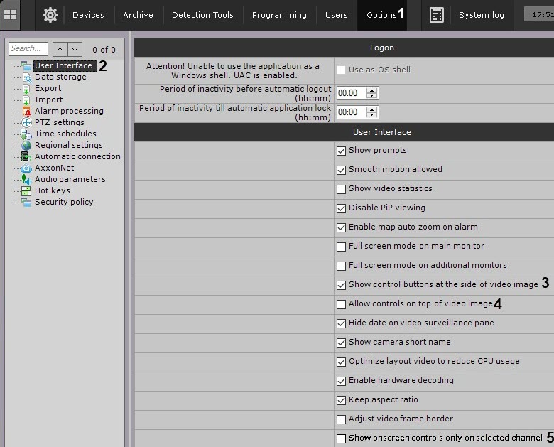 활성 창 이외의 다른 창에 창 요소를 표시할 필요가 없으면 선택한 채널에만 화면 컨트롤 표시 확인란을 선택하세요 (5). 이 매개변수는 비디오 이미지 위에 컨트롤 허용 확인란을 선택한 경우에만 유효합니다 (4).