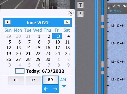 Click the indicator. The calendar opens. Select the date to which you want to jump in the archive and specify the time in HH:MM:SS format, by using the arrows or keyboard number keys.
