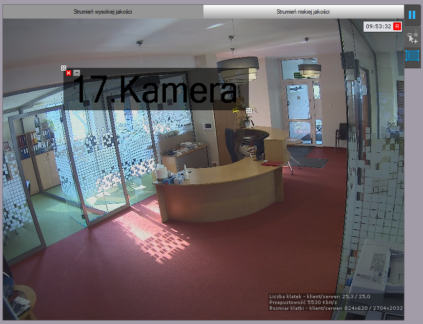 Dla ułatwienia pracy istnieje możliwość tymczasowego zatrzymania obrazu wideo poprzez naciśnięcie przycisku  i skonfigurowania maski prywatności na zatrzymanym obrazie wideo / stopklatce. Aby włączyć odtwarzanie strumienia wideo na powrót, naciśnij przycisk ponownie.