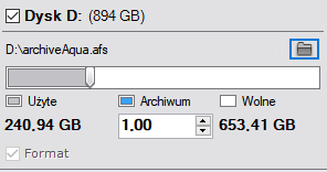Dla tego typu woluminu archiwum, należy podać rozmiar pliku (w gigabajtach), lub ustawić rozmiar, korzystając z suwaka. Wielkość archiwum musi być większa niż 1 GB. Jeśli system plików to Fat32, maksymalny rozmiar archiwum wynosi 4 GB.