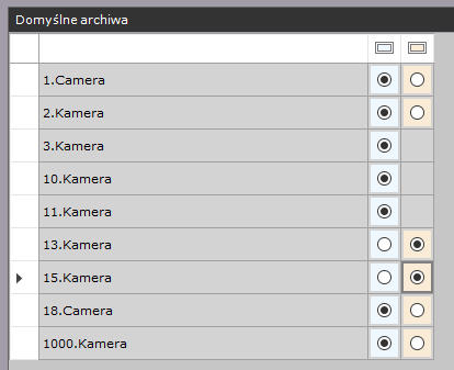Formularz Domyślne archiwa wyświetli listę kamer oraz archiwów, zaznaczonych odpowiednimi kolorami. Jeśli rejestrowanie wideo jest włączone dla przynajmniej jednego archiwum dla danej kamery, kamera ta jest zaznaczona jako zidentyfikowana ze swoim domyślnym archiwum. - Aby zmienić domyślne archiwum dla danej kamery, zaznacz odpowiednie pole kodowane kolorem.