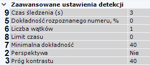 Jeśli wartość to Tak, śledzenie jest włączone, a numer tablicy rejestracyjnej jest rozpoznawany poprzez zestawienie klatek wideo. Jeśli wartość to Nie, śledzenie jest wyłączone, a numery tablic rejestracyjnych będą rozpoznawane dla każdej badanej klatki osobno, nie zwracając uwagi na detekcję w innych klatkach; jakość rozpoznanych tablic rejestracyjnych może się wahać od 0 do 100%.