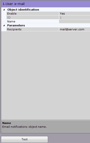 Przy naciśnięciu przycisku zostanie wysłana wiadomość do odbiorców (zobacz: Konfigurowanie Obiektu E-mail) o treści: "Test message".