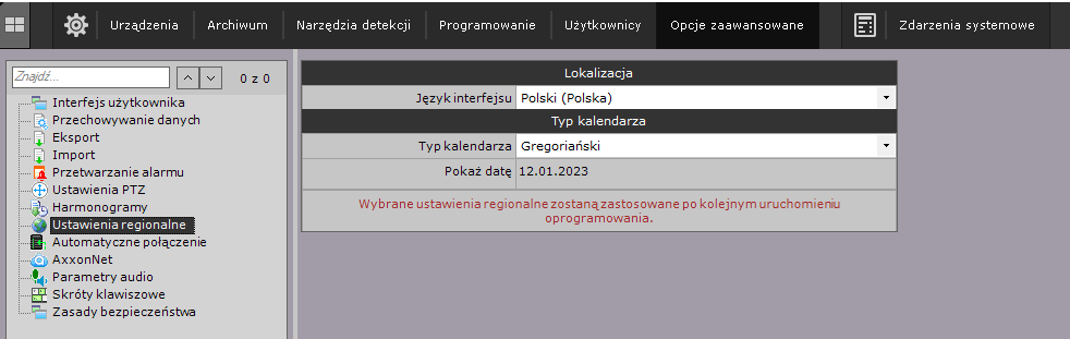 Nowe ustawienia kalendarza zostaną aplikowane po ponownym uruchomieniu Axxon One.