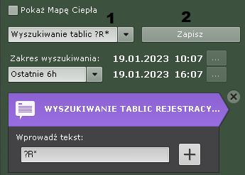 Aby zapisać zapytanie, określ jego nazwę (1), a następnie naciśnij przycisk Zapisz (2). Zapytanie stanie się dostępne w prawym dolnym rogu okna podglądu w trybie Archiwum(zobacz: Przeglądanie wyników zapisanego zapytania).