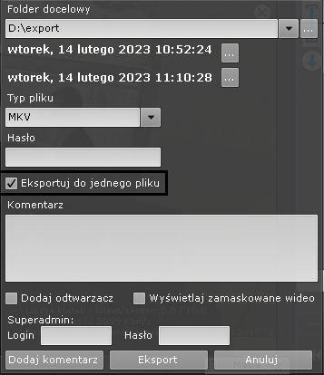 Nagrania wideo z każdej kamery będą wyeksportowane do osobnego pliku. Komentarze dodane podczas eksportu będą umieszczone w każdym wyeksportowanym wideo.