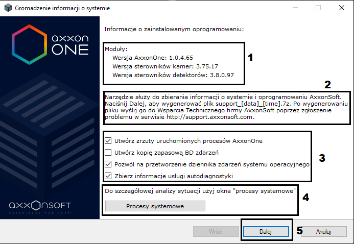 4. Przycisk uruchamiający usługę Procesy, która przedstawia szczegółowe informacje na temat procesów powiązanych z Axxon One (4).