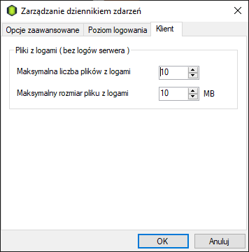 Aby zmienić ustawienia dotyczące maksymalnej ilości plików logowania bądź ich wielkości: