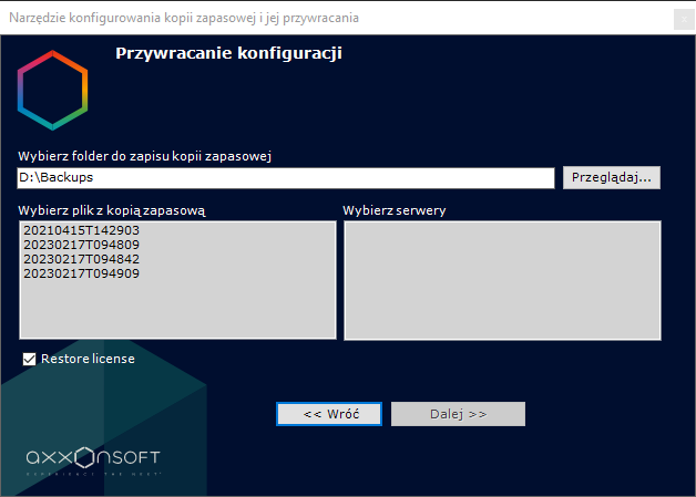 - Po wybraniu pliku, wyświetlone zostaną Serwery dostępne w obecnej Domenie Axxon w polu obok. Można wybrać Serwer z listy tylko wtedy, gdy jest on częścią /Domeny Axxon, a otwarty plik zawiera odpowiednią kopię zapasową. Aby rozpocząć proces przywracania, naciśnij Dalej.