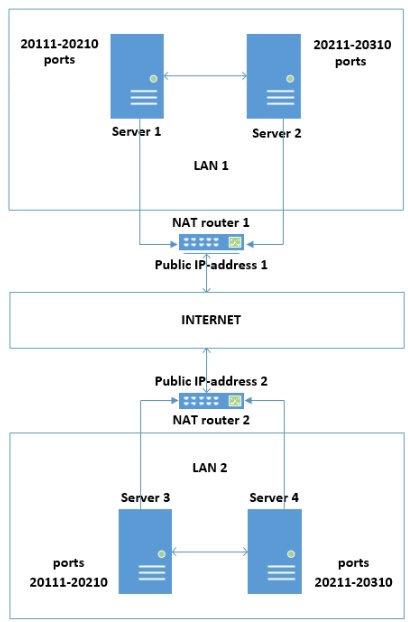 - Ręcznie dodaj inne Serwery do Domeny Axxon korzystając z publicznych adresów IP odpowiednich routerów oraz portów bazowych Serwerów (zobacz: Dodawanie Serwera do istniejącej Domeny Axxon).