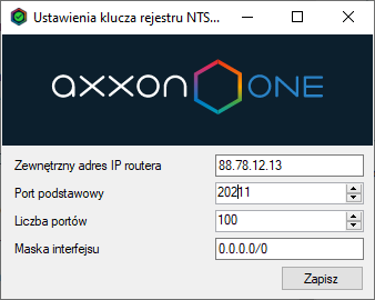 Ustal zasięg portów oraz publiczny adres IP routera na każdym Serwerze, który ma zostać dołączony do Domeny Axxon (zobacz: Narzędzie ustawień sieciowych).