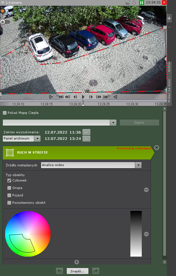 W trybie wyszukiwania w archiwum (zakładka Szukaj w oknie podglądu wideo) istnieje opcja ustawienia kryteriów wyszukiwania. Możesz wybrać spośród następujących filtrów wyszukiwania: