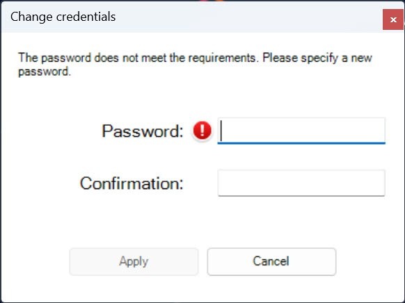 When you hover the cursor over the Security policy). Click the Apply button to save the new password. icon, a tooltip opens in which you can see the requirements for a new password (seeYou must securely save the new password (see How to recover the password of the root user (superuser)?).