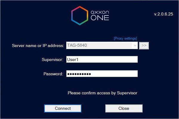 - command line by specifying the login, password and server parameters. All parameters are optional. For example: C:\Program Files\AxxonSoft\Axxon One\bin>Axxon One.exe --login=root --password=root --server=127.0.0.1. To connect to multiple servers (see Cross-System client), specify their addresses separated by commas. For example: C:\Program Files\AxxonSoft\Axxon One\bin>Axxon One.exe --login=root -password=root --server=10.0.11.30, 10.0.11.34.